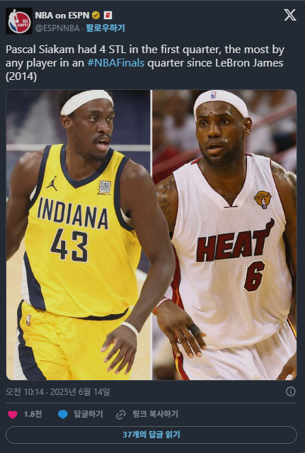 [NBA] 1쿼터 4스틸로 2014년 파이널 르브론 이후 쿼터 최다 스틸을 기록한 시아캄