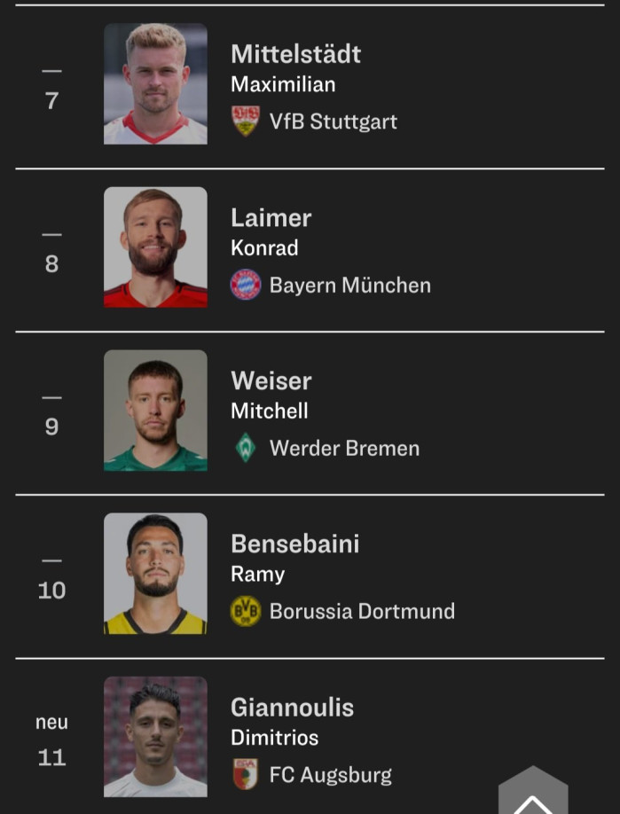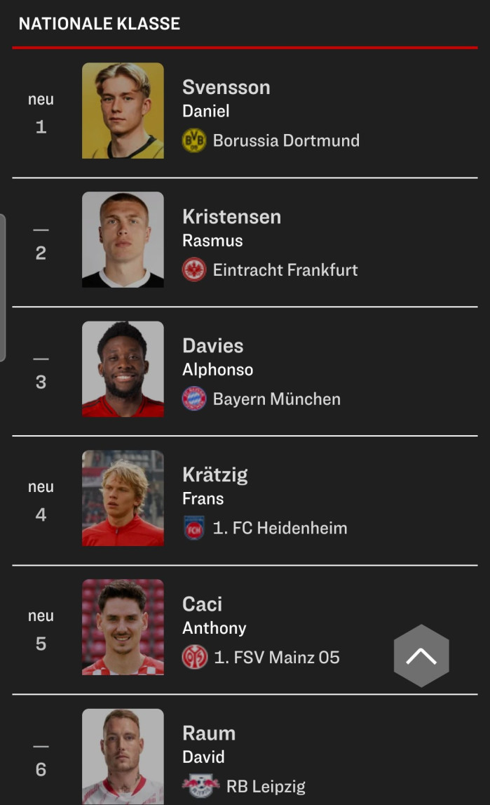 이번 랭킹에서 인터내셔널 클래스 등급에 이름을 올린 선수는 한 명도 없으며, 오직 네 명의 독일 선수만이 랭킹에 포함되었습니다. 내셔널 클래스의 선두는 도르트문트의 겨울 이적생 다니엘 스벤손입니다.