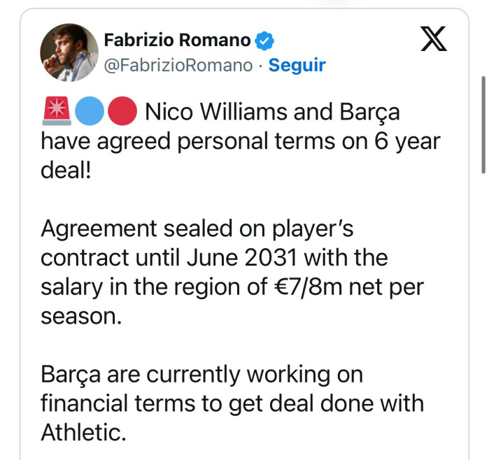 이적 시장 전문 기자인 파브리치오 로마노는 목요일(현지 시각) 자신의 SNS를 통해 니코 윌리엄스와 FC 바르셀로나가 개인 조건에 합의했다고 전했다. 계약 기간은 6년, 2031년 6월까지로, 니코 윌리엄스는 시즌당 순수입 기준 약 700만~800만 유로를 받게 될 것으로 알려졌다.